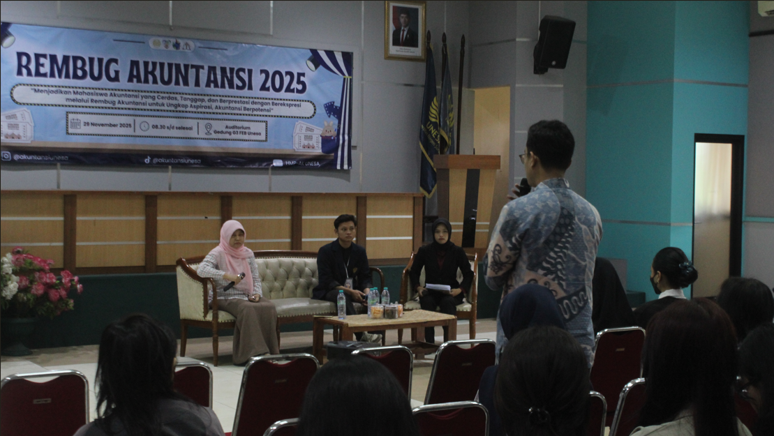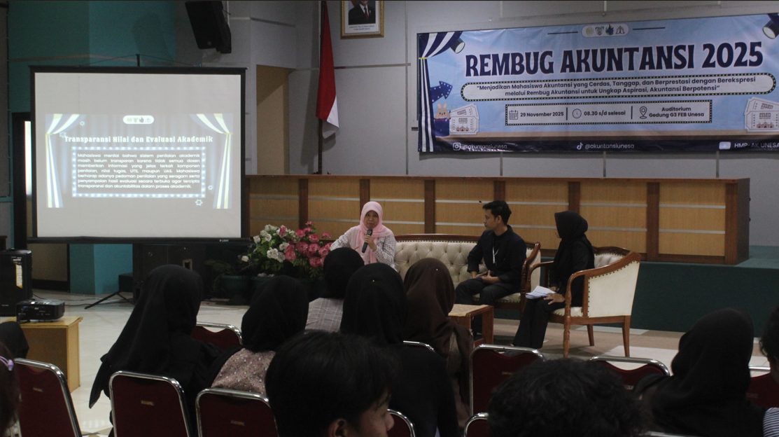 Sementara itu, Rembug Akuntansi yang kedua yang dilaksanakan pada Sabtu, 29 November 2025 di Auditorium Gedung G3 FEB UNESA difokuskan sebagai forum dialog antara mahasiswa dan pihak program studi. Dalam kegiatan ini, mahasiswa dari berbagai angkatan berdiskusi secara langsung dengan koordinator program studi mengenai berbagai topik penting, seperti kurikulum, sistem pembelajaran, fasilitas perkuliahan, serta kegiatan kemahasiswaan. Forum berlangsung dalam suasana terbuka dan interaktif, mendorong mahasiswa untuk menyampaikan aspirasi secara santun, argumentatif, dan solutif. Kehadiran pihak program studi turut memberikan umpan balik serta komitmen tindak lanjut terhadap masukan yang diberikan mahasiswa.