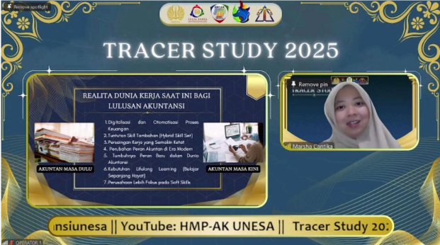 Departemen Advokasi dan Kesejahteraan Mahasiswa (Advokesma), Himpunan Mahasiswa Program Studi Akuntansi, Fakultas Ekonomika dan Bisnis, Universitas Negeri Surabaya sukses menyelenggarakan Tracer Study 2025 pada Sabtu, 6 September 2025. Kegiatan ini berlangsung secara daring melalui Zoom Meeting dan dihadiri oleh Alumni S1 Akuntansi Lulusan Tahun 2024.
